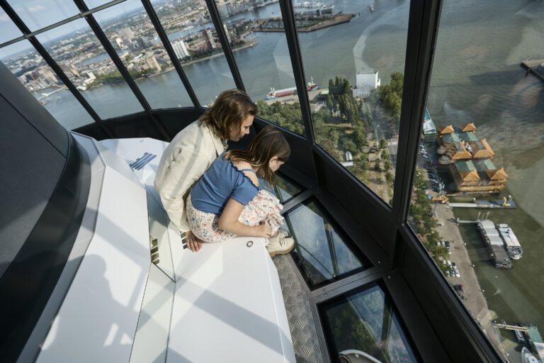 Experience the new *Euroscoop Experience and feast your eyes on the city and Rotterdam’s world port. During a lift-off experience we get you ready for a ride to the top. Music, lights, sound effects & spectacular views. As we take you to the highest point, we talk with Rotterdamese about the city, its diversity and its colorful identity. New is the intelligent glass floor that gives a panoramic view of Rotterdam, allowing you to experience the city in a unique and breathtaking way.